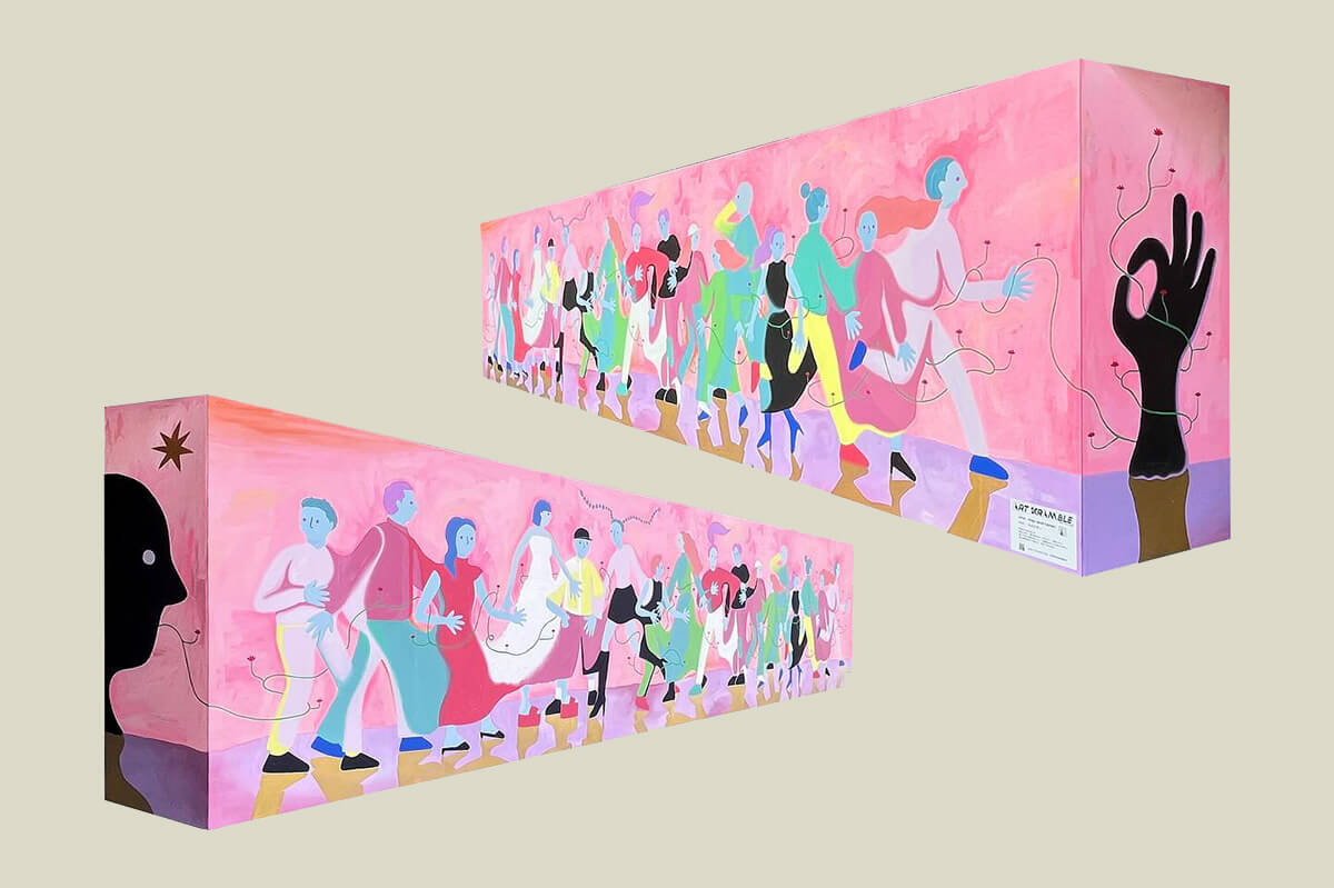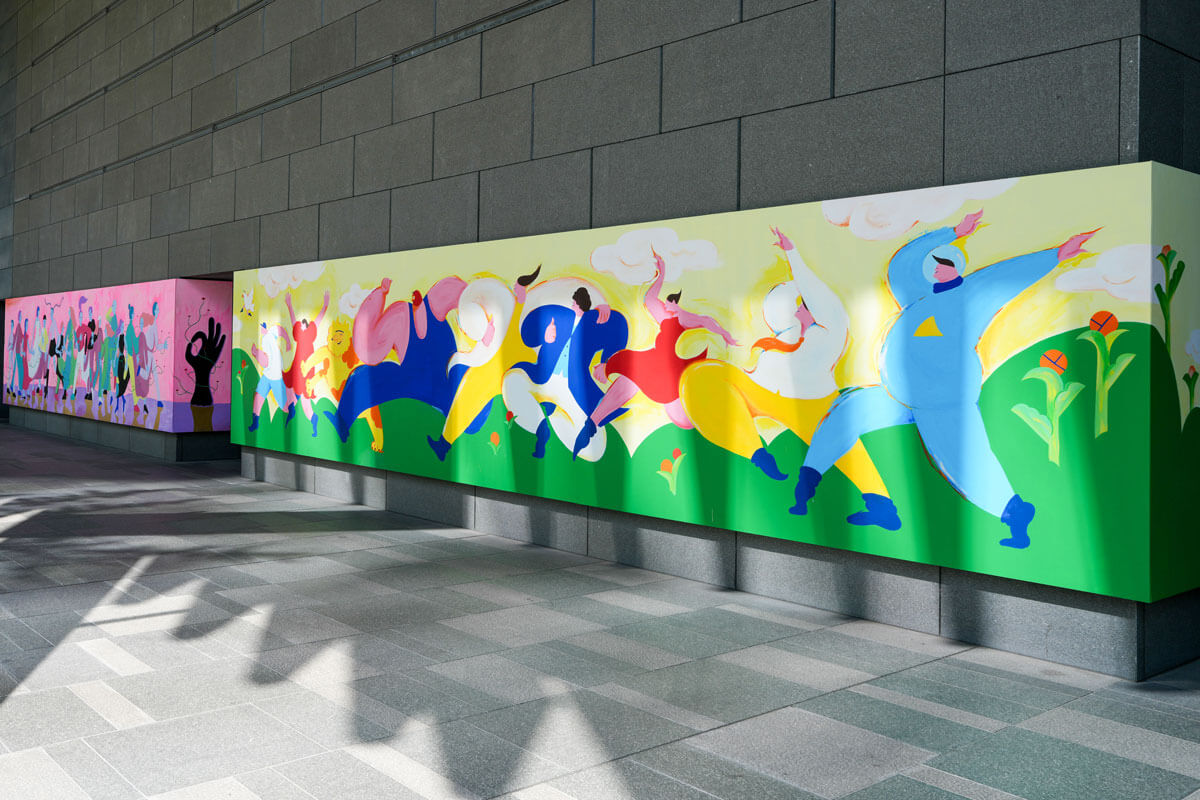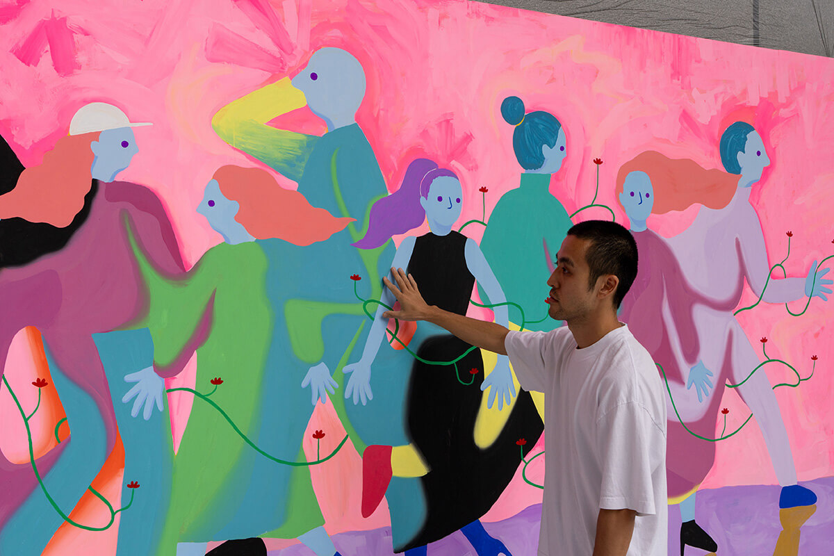 都会に展示されるので、明るい作品に仕上げたいなと思い、すぐに人をたくさん描こうと思いました。街には色んな人が集まってきて、同じ場所、同じ時間、同じ空気を共有しています。それを、体が重なり合い混ざり合っているように表現できたらいいなと思いました。 右から4人目~7人目あたりの混ざり方が気に入っていて、やりたかったことがより表現できた部分です。人と人を繋ぐようにツタを描いて、コネクションが全くないものを繋ぎ、同じ場所を共有していることを表現しました。 側面にもモチーフを描いていて、人の口から出たツタが人々を繋いで、手のOKサインまで繋がっています。OKサインはポップでキャッチーな感じ。明るい意味で捉えてもらえればと思います。