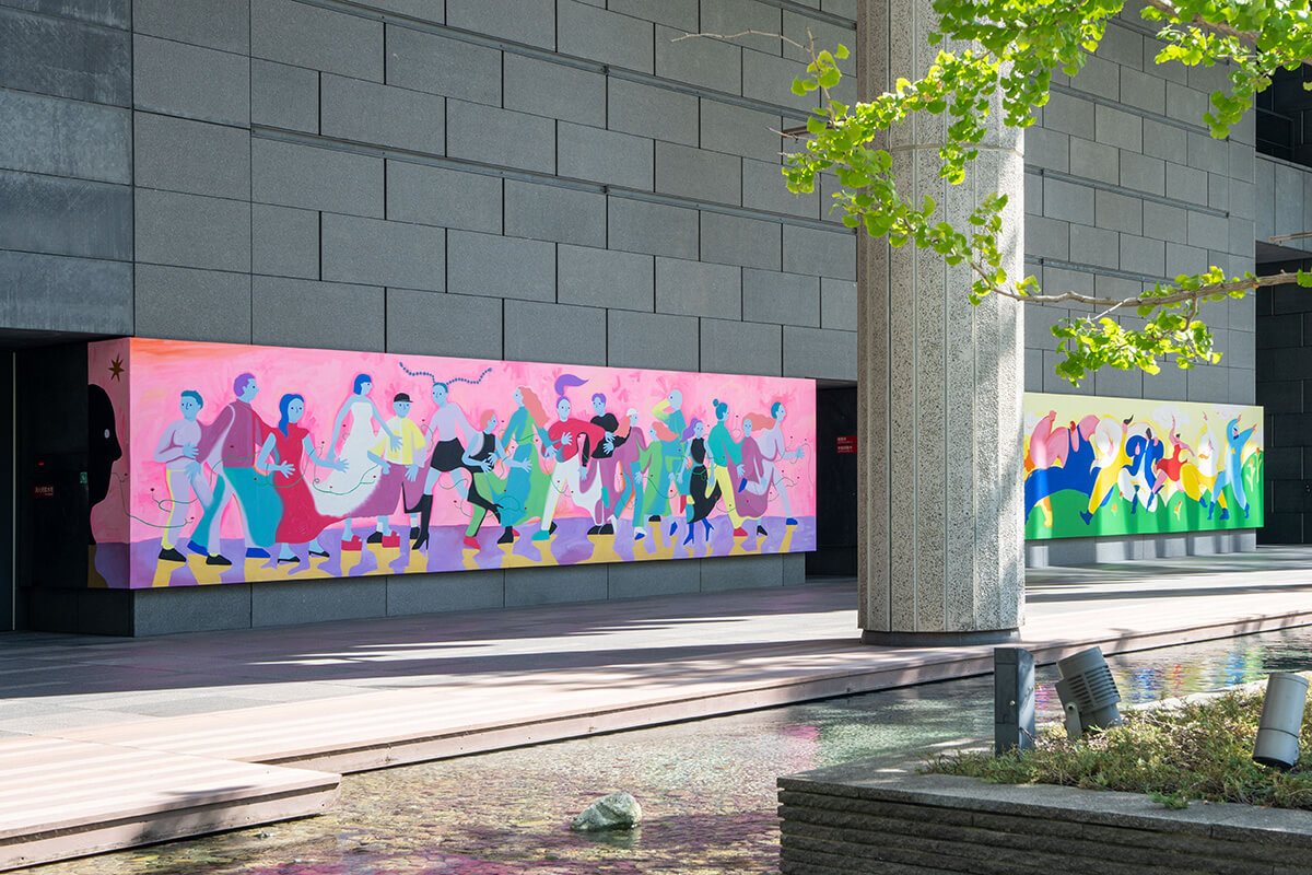 人生は続いていくんですけど、その続け方・進め方って人それぞれだなと思っています。私も昔は「こうしなきゃいけない」「ああしなきゃいけない」「走り続けなきゃいけない」という感覚が強くて、それに疲れることもあったんですが、芸術を学んで、そうじゃないなと思いだして。 今回の作品はみんなが進んでいる構図ではあるけど、走っている人がいれば踊っている人もいる、真ん中で舞っている人を隣の人が支えている。それぞれ色んな進み方で進んでいけたらいいなと思っているので、多くの人が訪れるこの場所に展示して、ふと自分がどう進んでいきたいかを考える、立ち止まって見ることができたらいいなと思いました。
