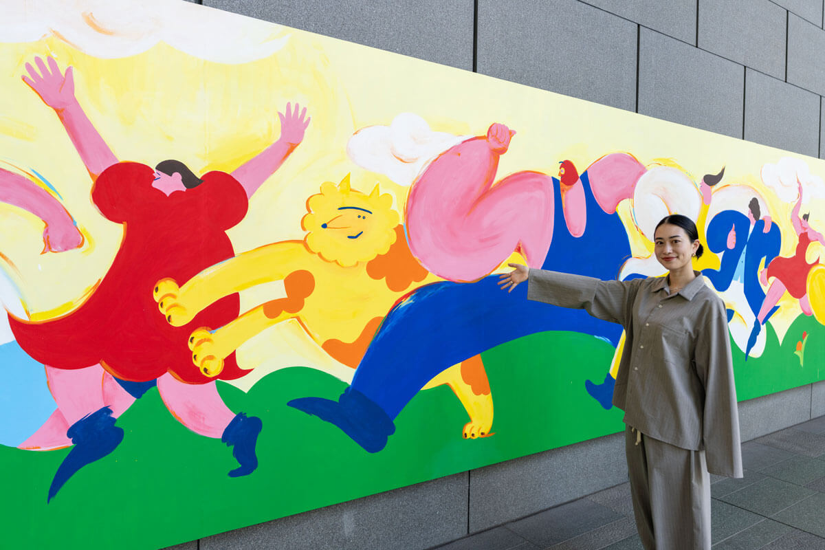 この大きさの作品を初めて描いてみて、すごく楽しかったです。体を動かすことが好きですが、描きながらも運動のように感じていたので、これからも大きい作品を描きたいなと思いました。 また改めて、描くってすごく楽しいと思ったので、絵を描くことやモノづくりの楽しさを伝える場づくりを今後もやっていきたいです。子どもたちはもちろんですが、特に大人の方がアートに触れるきっかけを作りたいですね。 地元ではワークショップもやっていて、子どもたちは自由に描くんですが、親御さんには簡単なぬり絵を薦めても下手なのでと断られて…そういう方にこそきかっけを作りたいです。簡単なきっかけで新しい何かが生まれると思うので、そんな場づくりは、今後イラストレーターとともにやっていきたいですね。