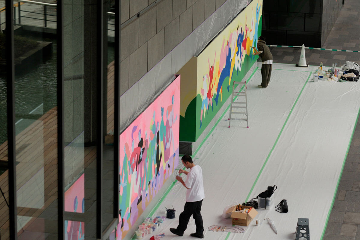 YANGYANGさんの作品は構成が近いですが、描き方が全然違うので、その対比を見てもらえればと。人によって見え方・感じ方が違うと思うので、今回一緒にできて良かったです。 壁画に憧れはあったんですが、色々と制限があり、自分のやりたいことがどこまで叶うかなという思いがありました。ただ今回制作してみて、道ゆく人が制作する様子を見て、同じ空気を共有して、空間を共にできたのは良い経験になりました。あと数回はチャレンジしてみたいですね。笑