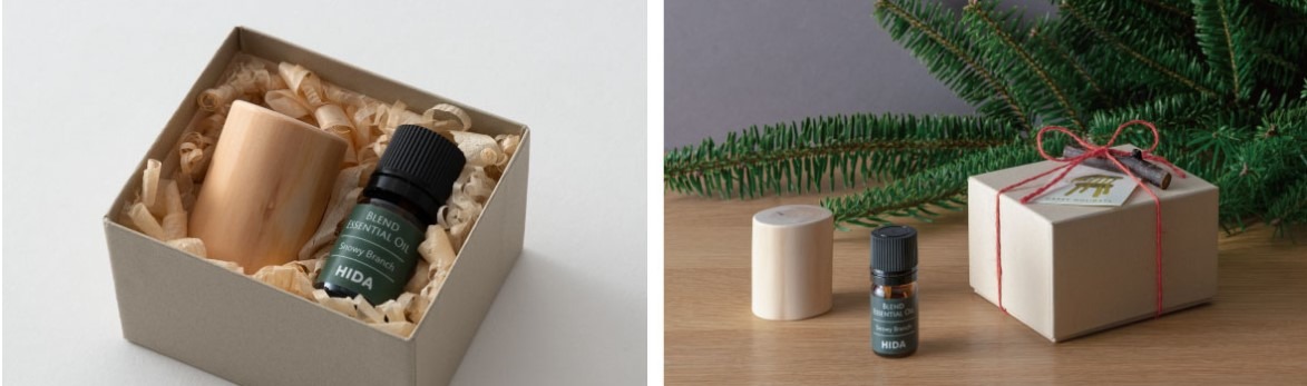 期間中は、お見積もりまたはご購入金額に応じてHIDAからのクリスマスプレゼントをご用意しています。また、クロモジやモミを配合したブレンドオイルと小枝ディフューザーセットを期間限定で販売しております。皆様のお越しをお待ちしております。