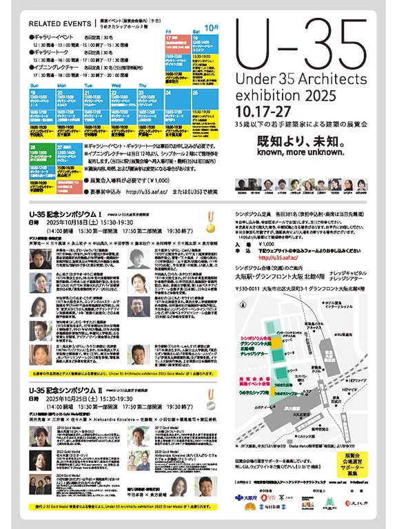 日本を代表し全国で活躍する、出展者のひと世代上の建築家一同に招き、これからの日本の建築のあり方を探るシンポジウムⅠ、また歴代U35Gold Medal受賞者が出展者との議論を行うシンポジウムⅡを開催します。