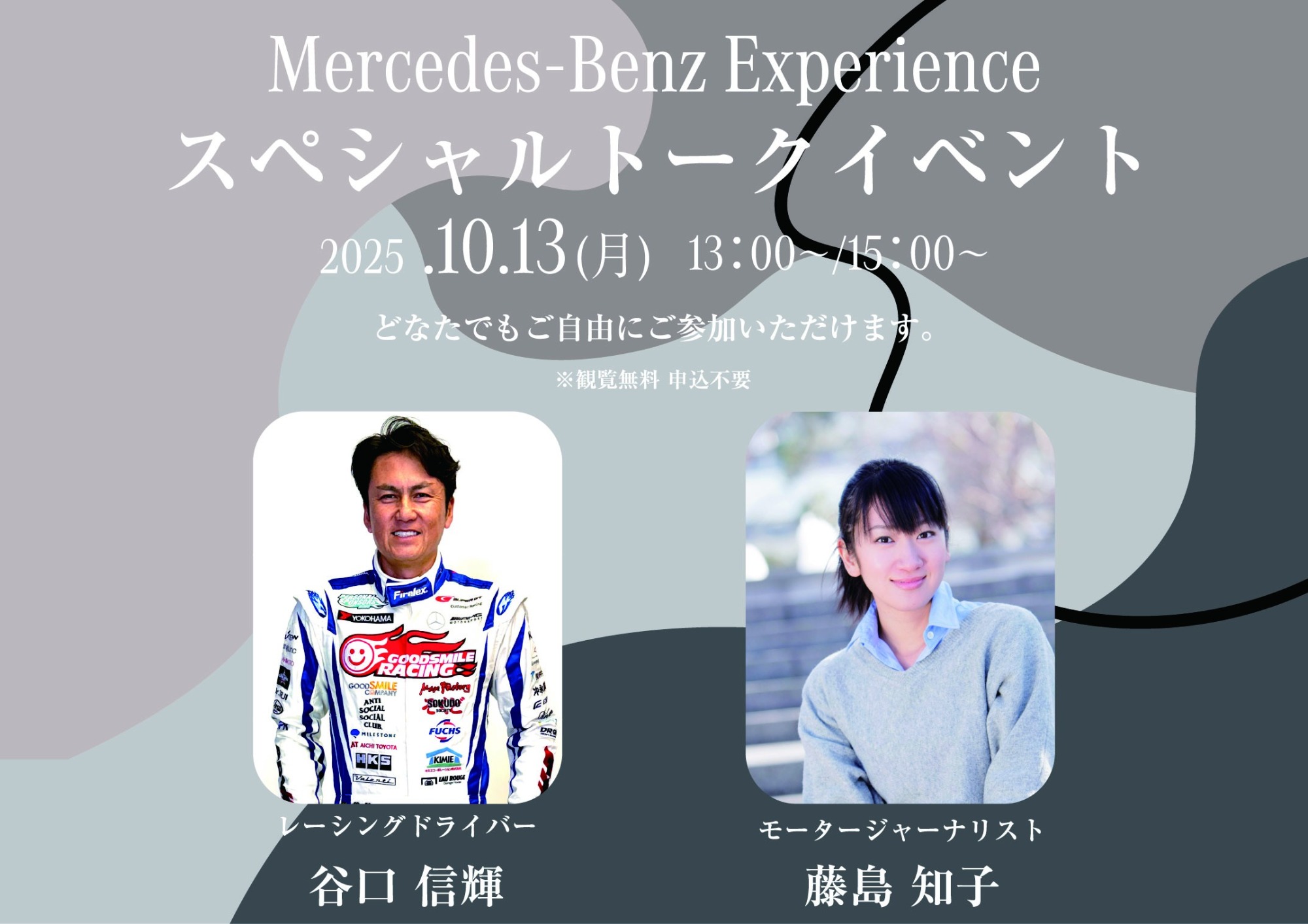 10/11〜13の3日間、メルセデス ミー 大阪で「MB Experience」を開催!AMG GTやSUPER GTマシン展示、13日には谷口信輝選手トークイベントも!試乗車多数。ぜひご来場ください。