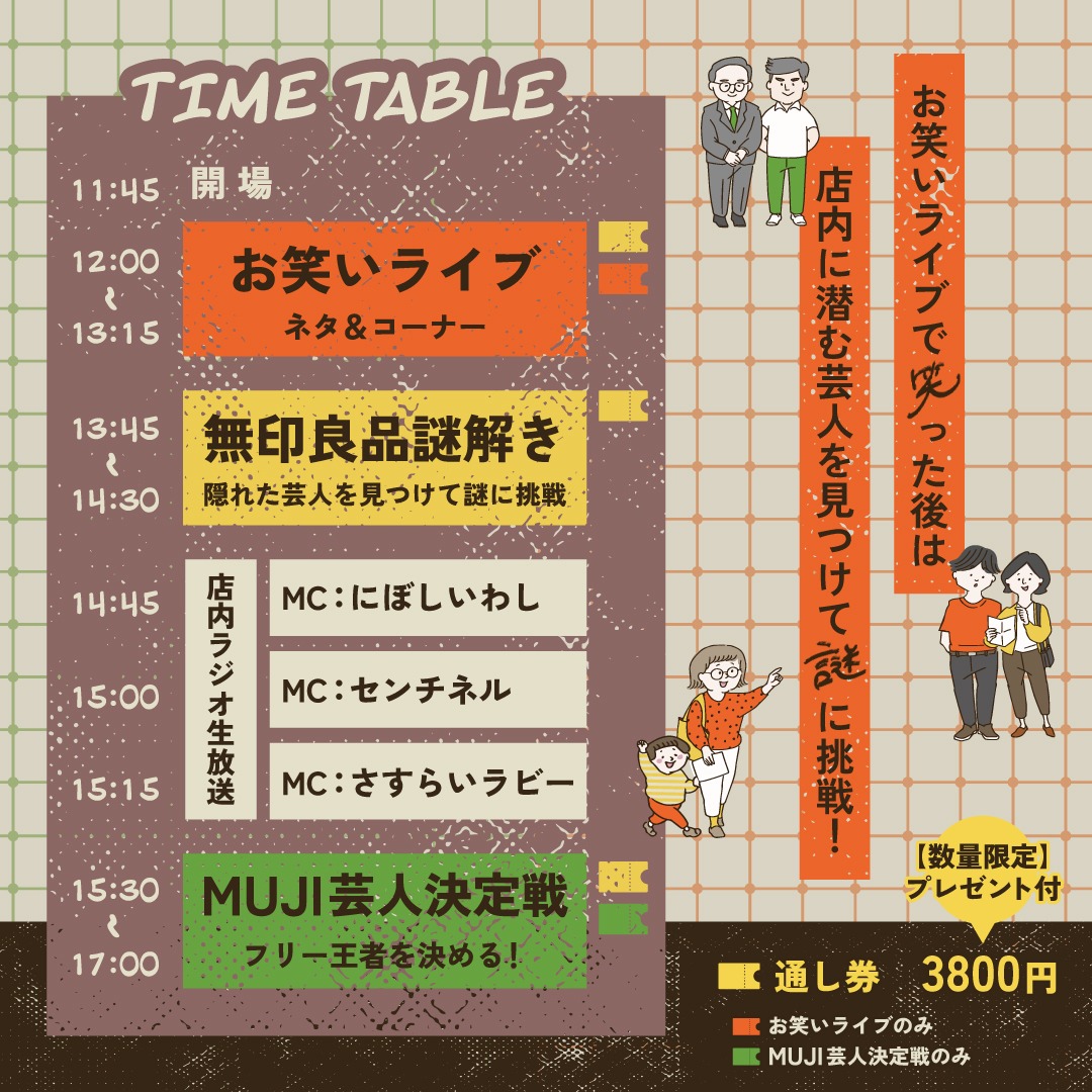 4階フロアに隠れている芸人から出題される謎を解く、謎解きゲームのほか、フリー芸人の一位を決めるMUJI(フリー)芸人決定戦など、楽しい内容が盛りだくさんです。
